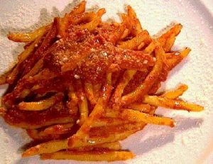 Il primo piatto teramano per eccellenza è invece quello dei maccheroni alla chitarra. Il nome “chitarra” deriva dallo strumento attraverso il quale l’impasto viene tagliato per ottenere i maccheroni. Qui vengono lavorati degli spaghetti a sezione quadrata, che generalmente vengono accompagnati con un sugo di castrato d’agnello, o d’agnello e peperoni o con un semplice sugo di pomodoro al peperoncino spolverizzato da abbondante pecorino.